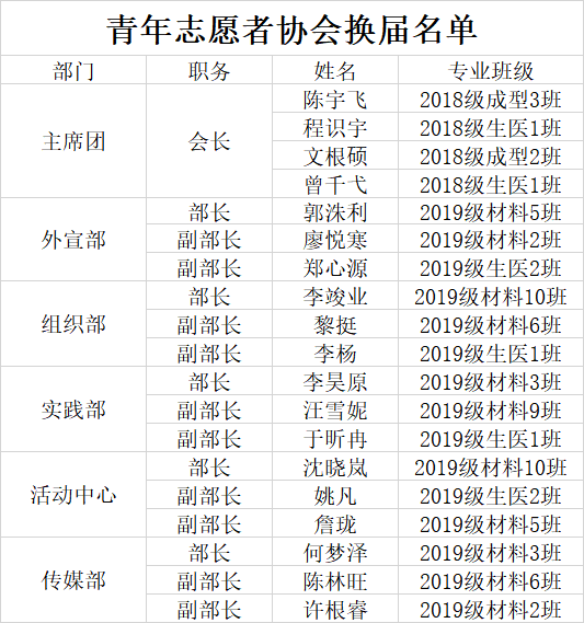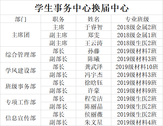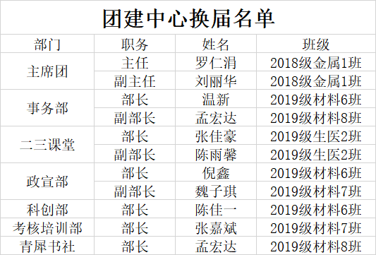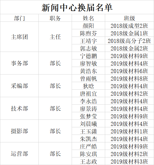 经过为期两周的学生自主申请、线上答辩、民主投票,现将材料学院团委部分学生组织(团建中心、青年志愿者协会、新闻中心、事务中心)换届结果公示如下: