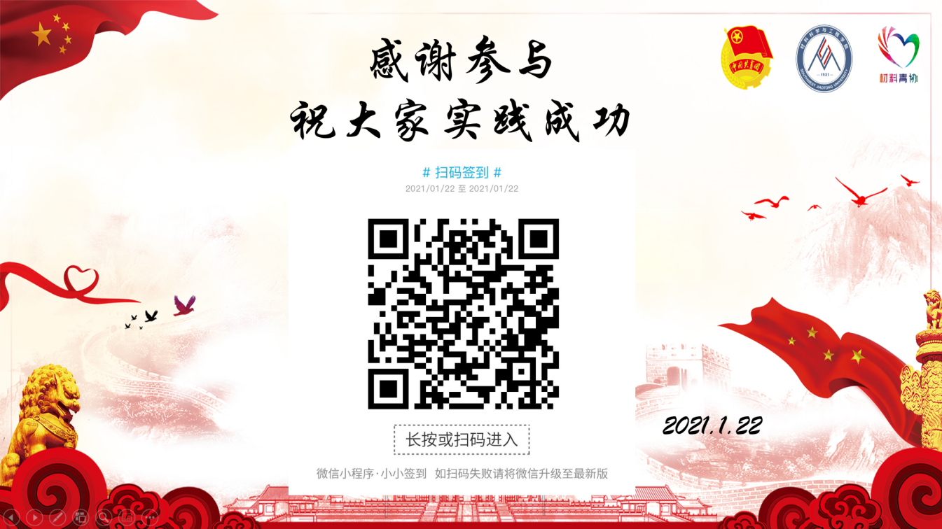 2021年1月22日,材料青协于19点准时举行了云会议“大学生寒假‘返家乡’调研社会实践活动出征仪式暨急救培训”,青协多名成员以及各实践队负责人参加此次会议。