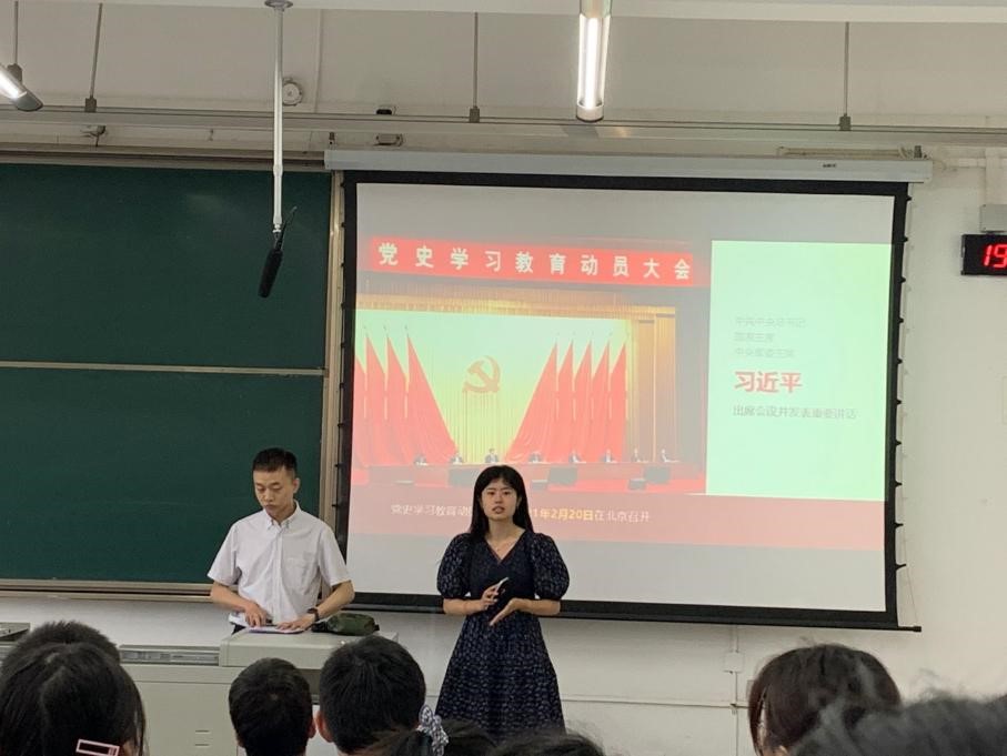 首先,邢斐学长立足中华民族伟大复兴的战略全局和世界百年未有之大变局的时代背景,分析中国当今时代所面临的问题和所处的世界形势,向同学们讲解了党史学习的必要性。