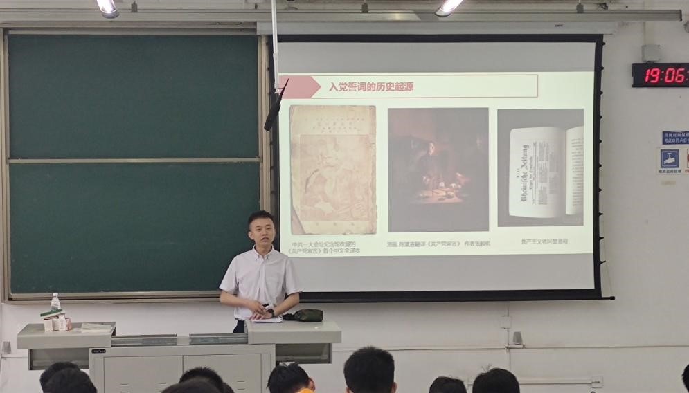 接着,邢斐结合详尽的史料带领同学们回顾了马克思主义在中国传播的历程,讲述了早期的马克思主义者为传播革命火种作出的不懈努力,并由此引出由贺页(man)朵在1934年写下的全国现存最早的一份入党誓词。随后,邢斐通过比较分析抗日战争、解放战争、新中国成立后等不同时期,不同地点的各个版本的入党誓词,帮助同学们充分认识到,尽管新中国入党誓词在党的历史上的很长一段时间都没有固定版本,但都饱含时代特征和革命精神,体现着共产党员信仰的力量。邢斐告诉同学们,现行版本的入党誓词是1982年党的十二大通过的,体现党组织在改革开放新时期,在注重党员理想信念教育的同时,对党员的要求是更加严格的。