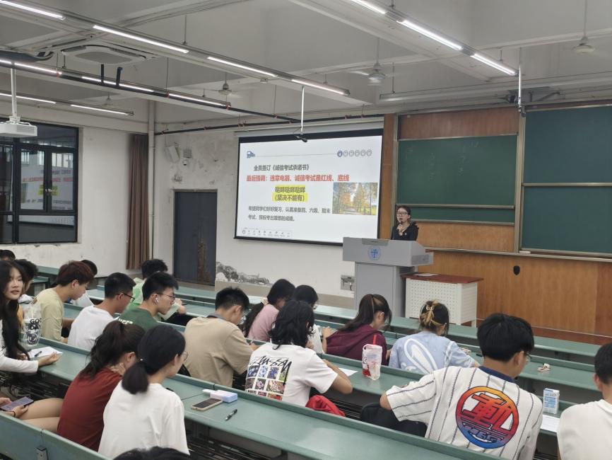 会议的最后一项内容为考风考纪、诚信考试教育。熊心怡老师首先带领同学们学习《西南交通大学本科考试考场管理办法》、《本科生考试违规处理办法》、《西南交通大学学生纪律处分规定》和分享警示案例进行教育。她表示,良好的考风考纪不仅关乎我们个人的学业发展,也体现了我们的个人素质和道德品质。希望同学们好好复习,诚实守信,认真准备四六级和期末考试,预祝同学们考出理想成绩。最后全体同学签订《诚信考试承诺书》。