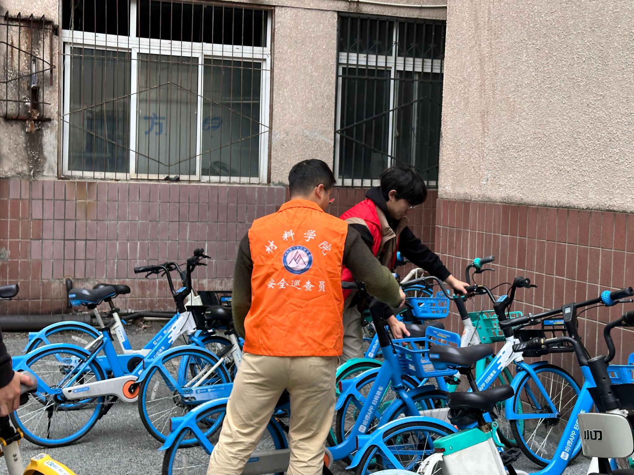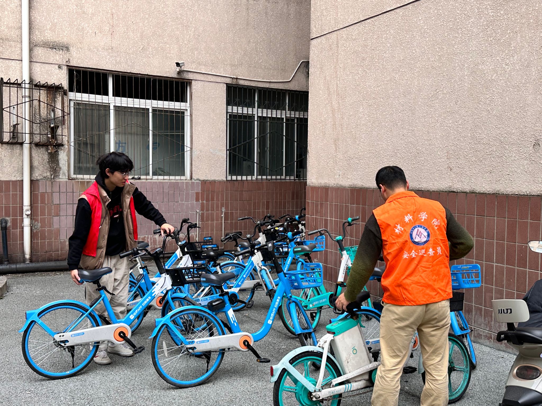在整治过程中,志愿者们充分发挥不怕苦、不怕累的精神,齐心协力,分工明确。他们首先对乱停乱放的自行车、电动车等非机动车辆进行逐一清理,将车辆推至指定停车区域。在摆放过程中,志愿者们格外细心,按照车型、停放方向等进行整齐排列,确保每一辆车都停放得规范有序。同时,对于长期占用车棚的 “僵尸” 车辆,志愿者们在详细登记车辆信息后,按照学校相关规定进行了妥善处理。此外,他们还对车棚及周边乱堆乱放的杂物进行了全面清理,使整个区域焕然一新。