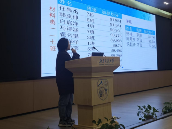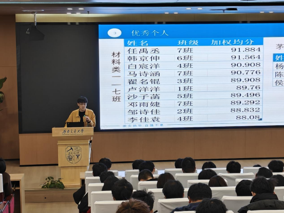 会议伊始,年级辅导员许欢老师和李瑞英老师同学们做了自我介绍。接着,李瑞英老师2024-2025学年秋季学期的智育成绩进行了全面总结。李老师用数据分析了各班均分和各班优秀人数,特别表扬了绩点排名前10的优秀学生,并邀请材料3班翟名锟同学分享学习经验。翟名锟提到:“合理规划时间、主动与任课老师沟通是提高效率的关键。”同时,许欢老师也指出部分学生存在偏科和挂科现象,提醒大家重视基础课程,积极参与课后答疑和学科互助小组。