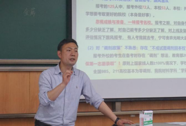 大会第一项,章春军发表讲话。并基于材料学院往年深造数据对考研形势进行了分析。他对2018级的同学提出一些建议,希望同学们可以早日确定自己的目标,比如理想的学校,并为之坚持不懈地奋斗。告诫同学们切忌走马观花,在考研时不要一味追求名校,要找到适合自己情况的更重要。
