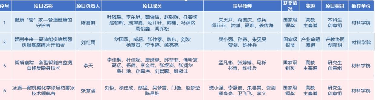材料学院连续多年获得大赛奖项,得益于学校、教务处、学院历年来高度重视中国国际大学生创新大赛,坚持创新引领创业、创业带动就业,提升了老师、学生的积极性,从而孕育出一大批具有价值的竞赛项目。