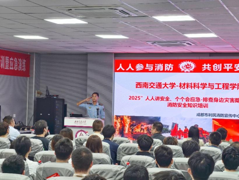 西南交通大学2025年度实验室安全培训及应急演练于4月27日在九里校区顺利开展,本次活动由 “平安交大” 建设委员会、国有资产与实验室管理处、保卫处联合主办,材料科学与工程学院承办。材料学院党委书记沈哲、资实处副处长闻毓民,材料学院2024级研究生及新入职教师100余人参加活动,培训环节由材料学院刘庆利老师主持。