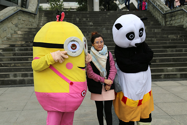 在这温馨浪漫的女生节现场,怎么少得了卡通宝贝的出现呢?一个个可爱的卡通娃娃在其中四处走动,时不时发几颗甜蜜的糖果,时不时传几张有趣的传单,时不时和几个漂亮的女同学合个影,也给女生节增添了一种萌萌的气氛。而那坐落在其中的舞台也时不时上演一些小表演,其中精彩的魔术很是抓人眼球。