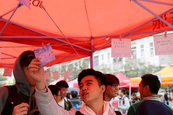 在那温馨的心愿屋里,女生们嘴角泛着微笑写下自己最甜美的心愿,挂在心愿墙上等着男生们来实现;男生们也兴致勃勃地在其中穿插,试图寻找称心的心愿。更令女生和男生们欣喜的是女生写完心愿还可以领到热乎乎的奶茶和甜美的小蛋糕,而为女生领下心愿的男生们也可以去抽奖。在这小小的一方天地里,每个都人化身为自己的幸运之神,花下月老。