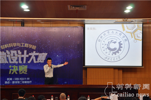 6月14日晚七点,由材料科学与工程学院主办,院学生工作组和团委承办的材料学院院徽设计大赛决赛暨科技文化月闭幕式在图书馆2号报告厅举行,出席本次晚会的有材料学院党委书记陈兴莲、党委副书记戈满寿、艺术与传播学院艺术设计系系主任陈立民老师,艺传学院李馨、候兵老师,以及材料学院崔国栋老师。