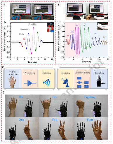 图4. 设计的PES在iHMI中的应用。(a) 检测PES握把力量的照片。(b) 不同握把强度下PES的短路电流输出。(c) 放置在书中的PES检测开/合书角度的照片。(d) PES在关闭阶段(红色区域)和开启阶段的短路电流输出(蓝色区域)。(e) 一种人机遥控系统示意图,采用几个简单的电气模块实现手势远程控制。(F) 基于PES的手势远程控制的应用。