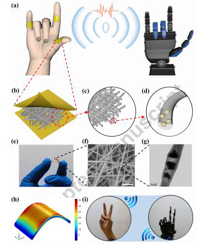 图1. 基于CPZN的自供电PES的结构设计。(a) 应用于iHMI领域的开发智能传感器示意图。(b) 装置,(c) NFs薄膜和(d) 单跟NF的示意图。(e) 弯曲模式下传感器的照片。(f)NF的SEM图像。(g) 单跟NF的TEM图像。(h) FEM模拟的结果。(i) 基于PES的机器人手遥控器的应用。
