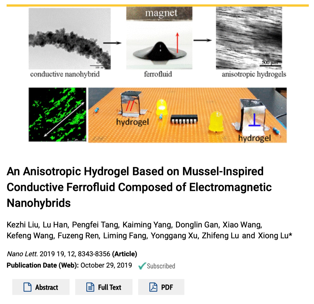 近日,威廉希尔WilliamHill官方网站鲁雄教授为通讯作者,刘科志和韩璐博士为共同第一作者,在美国化学会旗下著名学术期刊Nano Letters(影响因子12.279)上发表的论文An anisotropic hydrogel based on mussel-inspired conductive ferrofluid composed of electromagnetic nanohybrids入选“ Top 20 most downloaded articles”。