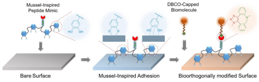 Scheme 1. The molecular binding mechanisms of mussel-inspired peptide adhesion and bioorthogonal molecular conjugation for surface bioengineering.