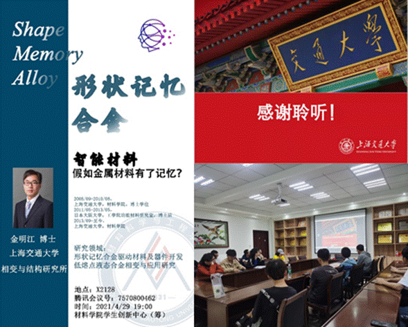 2021年4月29日晚上19:00至21:00,在犀浦校区X2128会议室,来自材料、土木、人工智能、自动化等专业的师生齐聚一堂,尽情享受由上海交通大学材料学院金明江博士带来的题为“形状记忆合金智能驱动应用与发展”的学术盛宴。