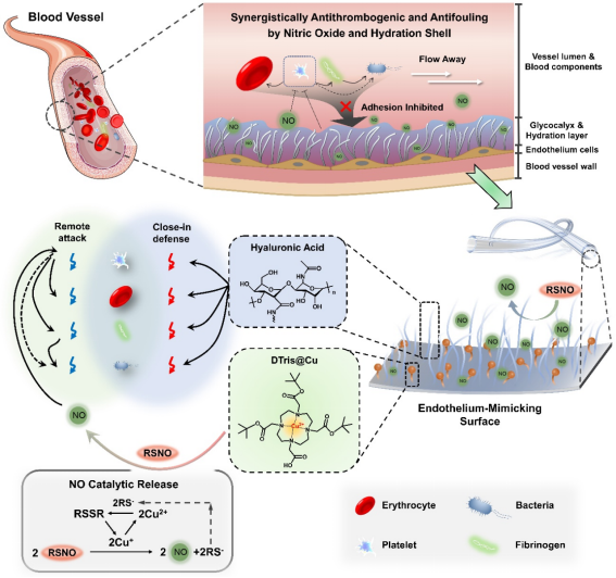 人类血管内层由于具有一层内皮细胞组成的内膜结构,其表面具有抗黏附分子可以有效防止游离细菌与血小板黏附;而内皮细胞具有的内分泌功能,将持续释放如一氧化氮等生物活性分子,远程调控凝血反应,经由两者共同作用,维持正常的血管生理功能。临床上,往往采用聚氯乙烯材质的导管来实现“临时血管”的作用,其可以直接实现药物输送或是进行临时的体内循环,然而,由于表面并不具备正常血管相应的功能性,往往会导致感染或是血栓形成,严重的甚至将危及生命。而凝血与细菌的黏附是相互促进的过程,细菌的黏附会导致凝血的发生,而凝血的发生则为细菌的黏附提供了温床。因此,相比较传统的使用药物包载,或是在表面接枝单纯功能分子等策略,并不能够从根本上解决长期使用导管引发的并发症问题。而正如前文所述,对血管内膜的功能进行生物仿生,似乎是更为形象化和具体化的设计思路。