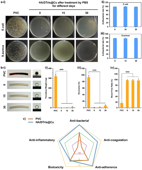 图2. 远程-近程功能协同血管内膜仿生表面涂层导管实现了优异的长效抗菌抗凝血性能。