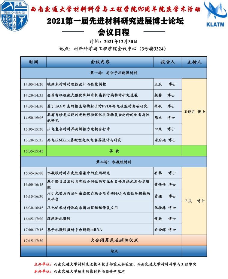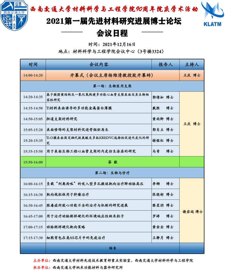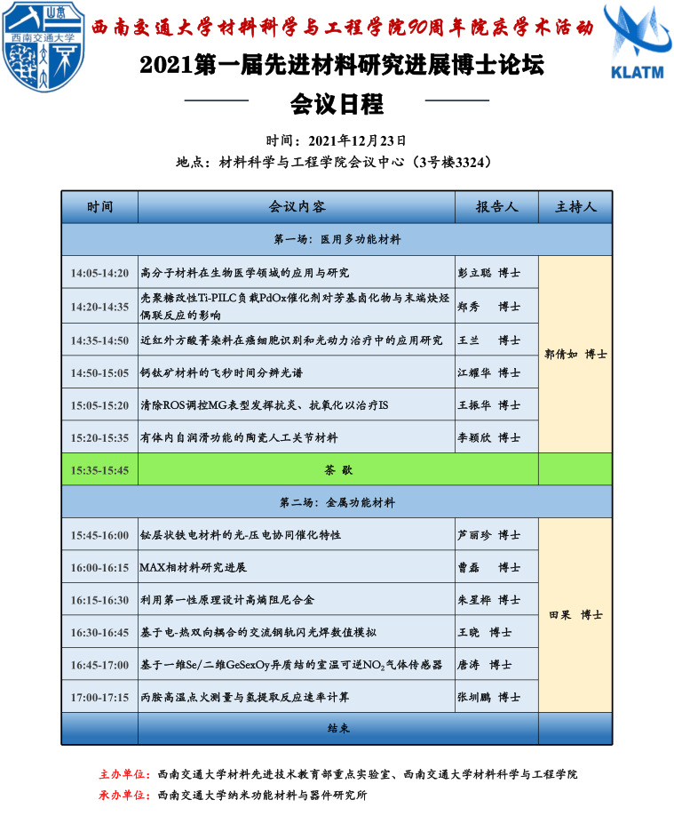 先进材料的研究对于培育经济发展新动能、获取未来竞争新优势等方面具有重大意义。新材料技术是高新技术的物质基础,为主动服务于国家发展新材料的重要战略定位,集中力量推进关键核心技术的攻关和产业创新;推进材料研究向“能源+材料”“基础+高端”方向发展,材料学院2021级博士班将于2021年12月16日,12月23日,12月30日举办威廉希尔WilliamHill官方网站90年院庆学术活动——2021第一届先进材料研究进展博士论坛。本次论坛分为生物医用支架,生物与诊疗,医用多功能材料,金属功能材料,高分子及能源材料,水凝胶材料六个分会场,涵盖了先进材料研究前沿的36个方向,并由2021级博士进行主题报告。希望借举行此次博士论坛的契机,为材料学院科研工作者提供研究工作交流的平台,吸引更多先进材料领域的老师进行指导,开启更深层次的创新合作。