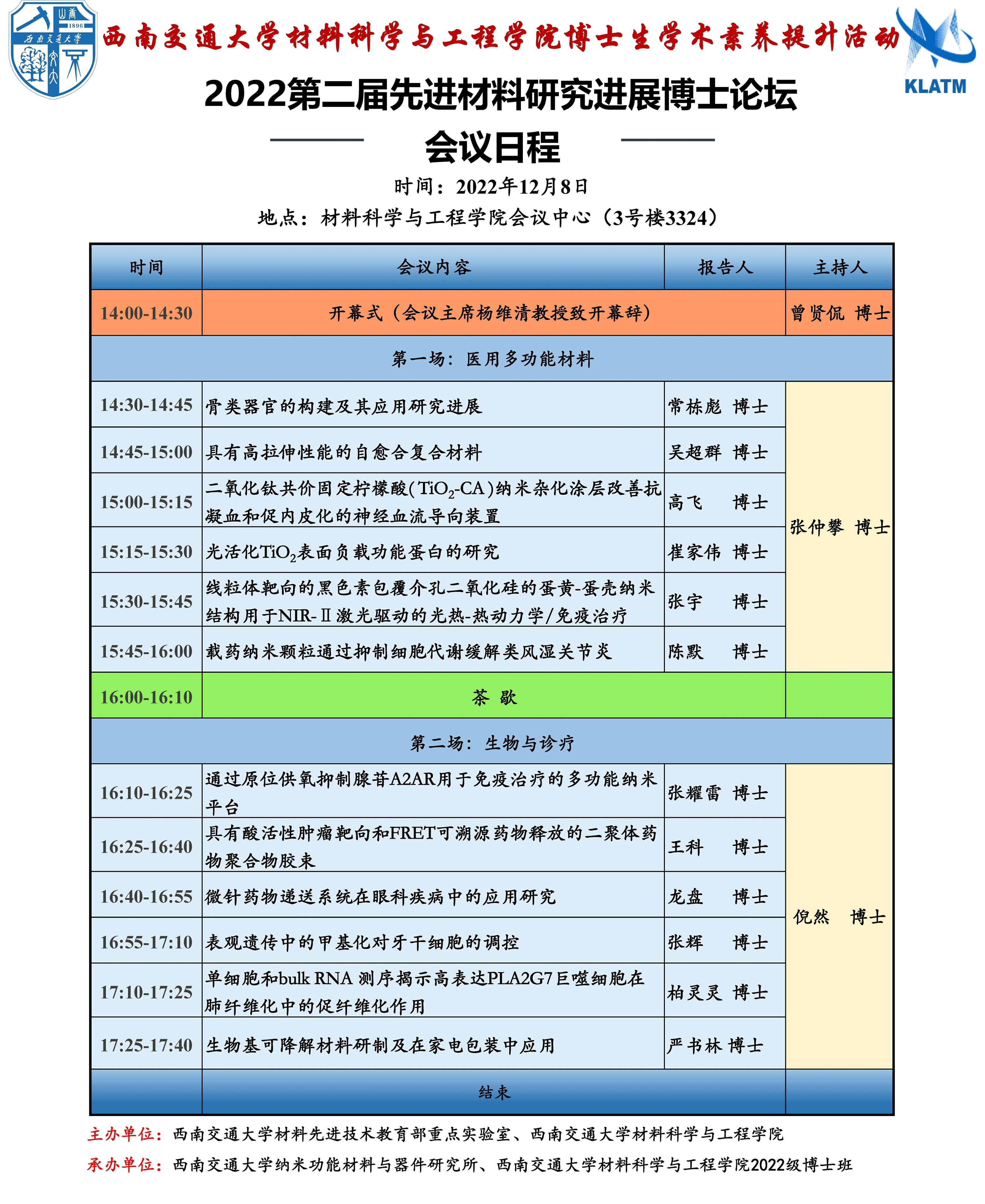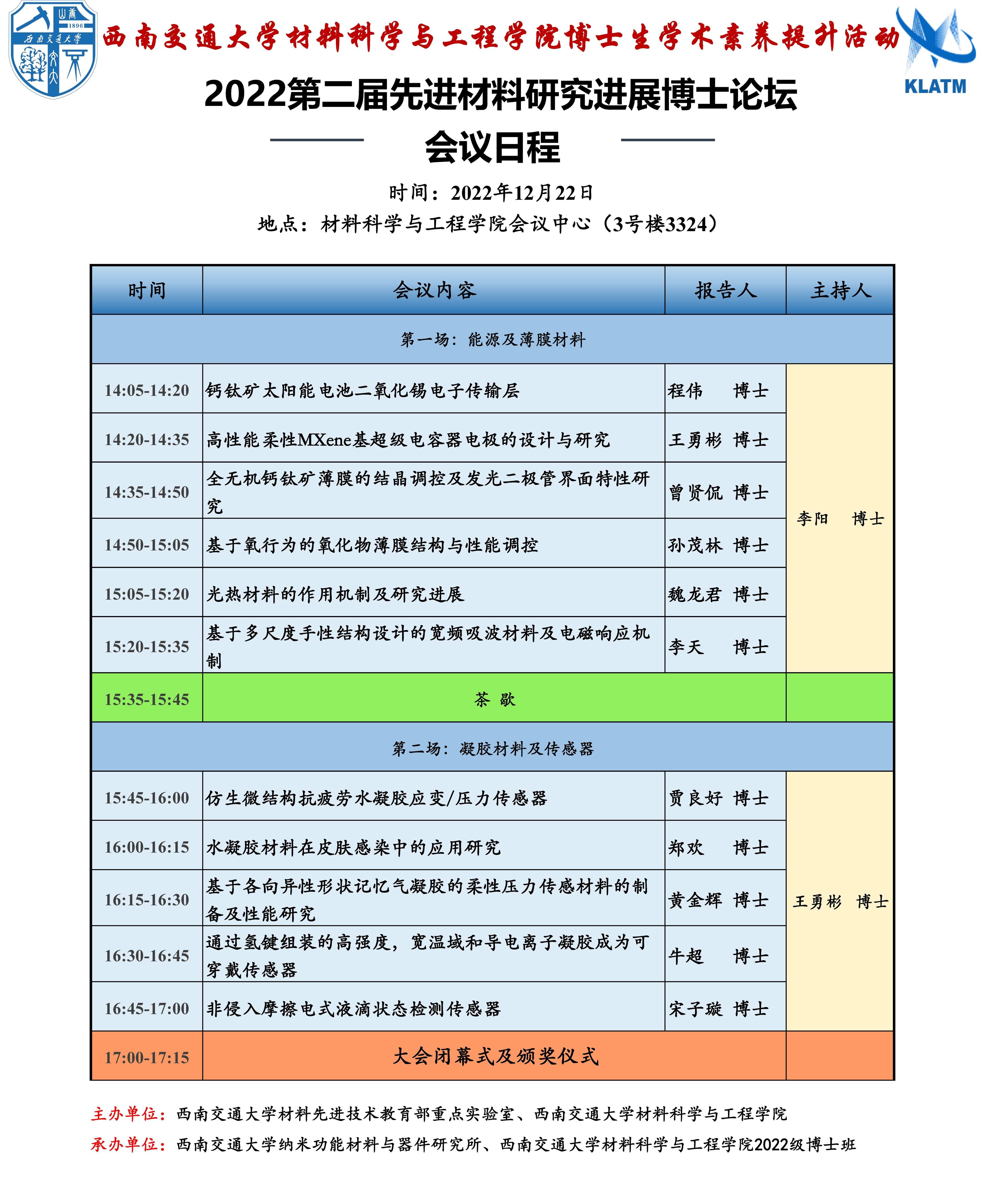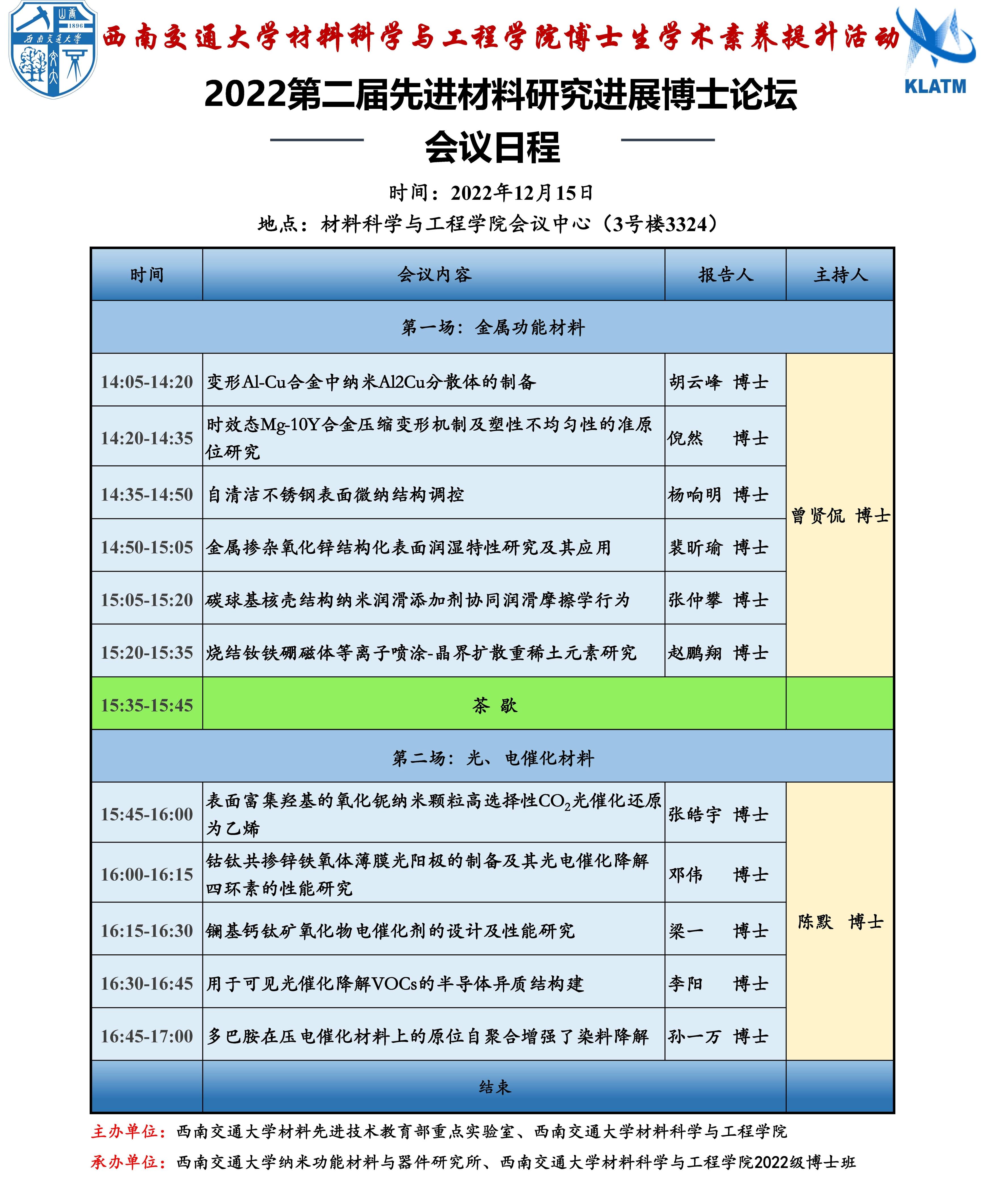 由西南交通大学材料先进技术教育部重点实验室、威廉希尔WilliamHill官方网站主办,西南交通大学纳米功能材料与器件研究所、威廉希尔WilliamHill官方网站2022级博士班共同承办的“威廉希尔WilliamHill官方网站博士生学术素养提升活动——2022第二届先进材料研究进展博士论坛”将于2022年12月08日、2022年12月15日、2022年12月22日在材料科学与工程学院会议中心(3号楼3324)召开。会议邀请了材料科学与工程学院2022级博士研究生进行主题报告,报告将围绕医用多功能材料,生物与诊疗,金属功能材料,光、电催化材料,能源及薄膜材料,凝胶材料及传感器多方面的学科前沿交叉问题展开,旨在促进材料科学学科发展、合作与创新,激发思想碰撞和产学研合作,拓宽我院博士研究生的学术视野,提升我院博士研究生的创新能力和学术素养,搭建良好的学术交流平台。诚心期待各位专家学者前来,共同进行学术交流研讨。