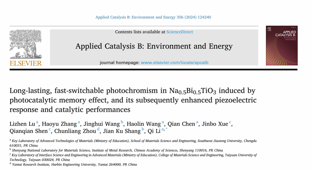 李琦教授团队在近期的研究工作中发现,钙钛矿型Na0.5Bi0.5TiO3(NBT)陶瓷通过光催化记忆效应能在室温下对可见光产生明显而持久的光致变色行为;同时,其颜色变化也可以通过简单的红外光照射在几秒钟内快速恢复,有利于应用于需要快速方便擦除的过程。这种通过光催化记忆效应导致的光致变色现象还改变了其内部电子结构,增强了其压电响应,更好地促进了光生载流子分离,从而对其光催化、压电催化与光压协同催化性能产生了显著的影响。实验和理论分析结果表明,在光致变色过程中产生的稳定氧空位显著增强了NBT陶瓷粉对O2和H2O的吸附,增加了活性氧物质⋅O2-和⋅OH的生成,从而增强了其降解水中盐酸四环素(TC-HCl)的性能。相关研究以“Long-lasting, fast-switchable photochromism in Na0.5Bi0.5TiO3 induced by photocatalytic memory effect, and its subsequently enhanced piezoelectric response and catalytic performances”为题在线发表于《Applied Catalysis B: Environment and Energy》(https://doi.org/10.1016/j.apcatb.2024.124240)。西南交通大学材料学院博士研究生芦丽珍为论文第一作者,李琦教授为论文的通讯作者。该项工作得到了国家自然科学基金、四川省应用基础研究计划以及中央高校基本科研业务费科等项目的支持。