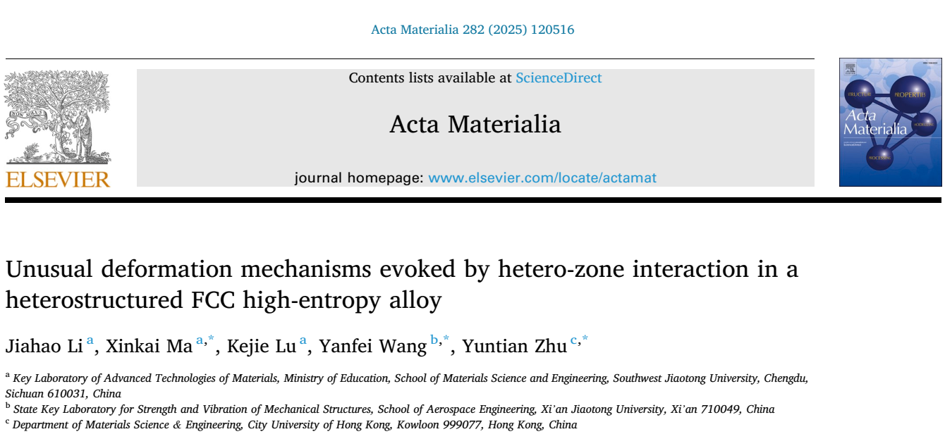 相关成果以“Unusual deformation mechanisms evoked by hetero-zone interaction in a heterostructured FCC high-entropy alloy”为题发表在工程技术-材料科学领域顶级期刊《Acta Materialia》上。论文的第一作者为我院2021级硕士生李家豪。论文的主要合作者还包括西安交通大学王艳飞副教授和香港城市大学朱运田教授。