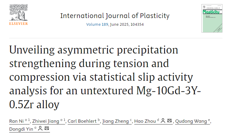 近日,我院尹冬弟教授、博士生倪然等在无织构、无孪晶的析出强化型镁合金(Mg-10Gd-3Y-0.5Zr)中,首次发现了析出强化效果在拉伸与压缩加载下存在显著差异,即析出强化的拉压不对称性。通过系统分析晶粒尺度滑移活性、原子尺度位错-析出相交互作用,结合CRSS的定量计算,揭示了其微观机制。此研究提醒我们在研究镁合金时效强化时必须要考虑其加载方向,为全面理解和调控镁合金析出强化提供新见解。相关工作以“Unveiling asymmetric precipitation strengthening during tension and compression via statistical slip activity analysis for an untextured Mg-10Gd-3Y-0.5Zr alloy”为题发表在金属材料和固体力学领域高水平期刊International Journal of Plasticity。论文主要合作者还包括辽宁材料实验室周浩、密歇根州立大学Carl Boehlert、重庆大学郑江、上海交通大学王渠东等。