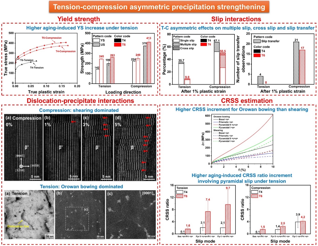 镁合金因其低密度和高比强度,被视为航空航天、轨道交通等领域轻量化的理想材料。析出强化是提升镁合金强度的重要策略之一。因此,深入全面理解析出强化具有重要的科学和工程意义。通常,学界在评价和研究镁合金的析出强化时会忽略加载方向(拉伸/压缩)。但是,最新的研究表明,位错并不总是绕过析出相,在特定的条件下也会切过析出相。再考虑到镁合金中普遍存在的拉压不对称性。那么,在拉压加载下,位错与析出相的交互作用是否会不同?由此导致的析出强化效果是否会不同?换句话说,镁合金的析出强化是否会具有拉压不对称性?将是一个有趣的问题。