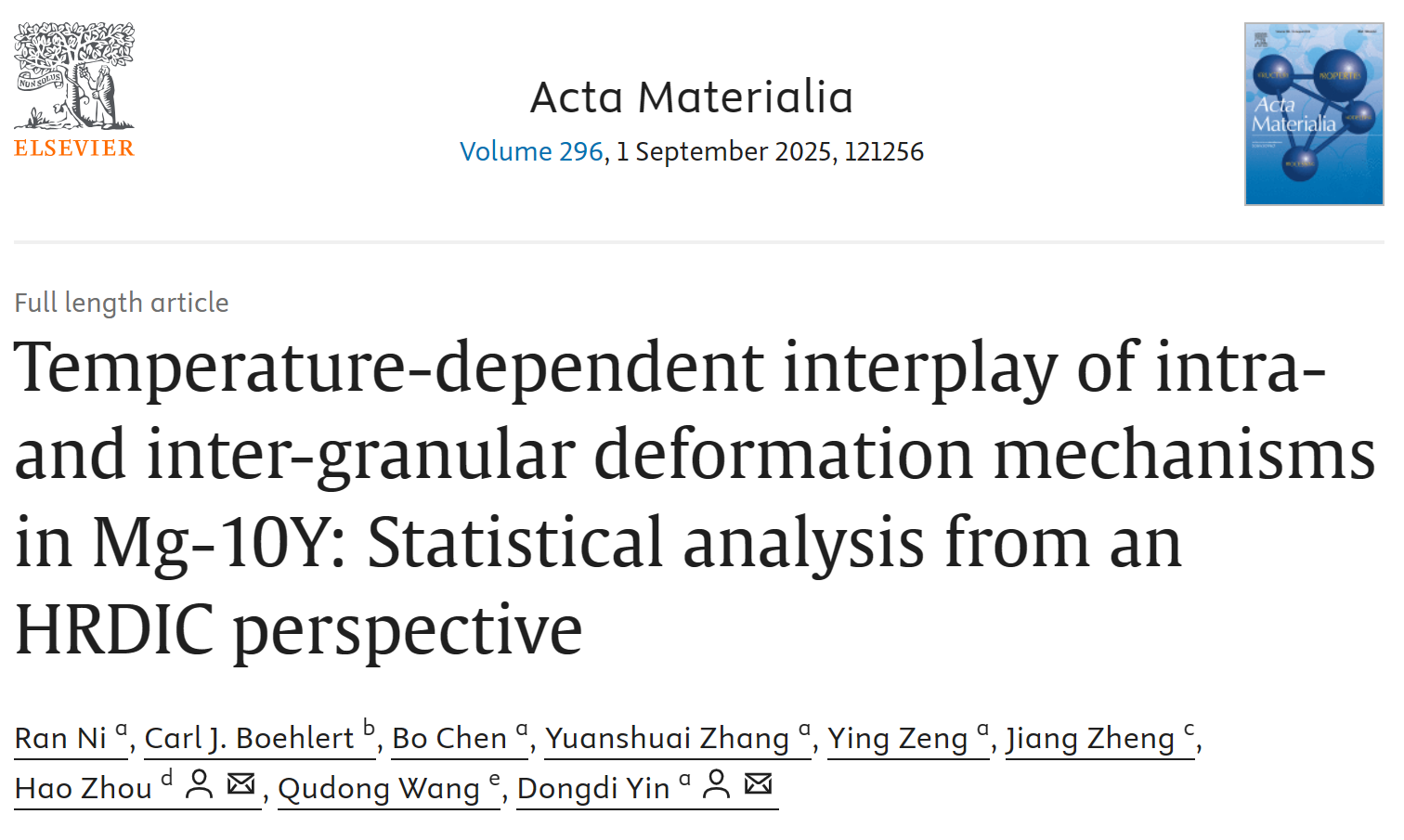近日,我院尹冬弟教授、博士生倪然联合辽宁材料实验室周浩研究员等基于自主开发的晶粒变形多模态自动分析框架(AutoGrainDAM,Int. J. Plast. 182 (2024) 104119),针对当前研究通常孤立考察晶内或晶间变形的局限,结合HRDIC与EBSD数据融合技术,定量统计分析了Mg-10Y合金在单轴压缩过程中多种变形机制及其应变分配的温度依赖性。统计样本共计约4500万个应变测量数据点。该研究完整清晰地揭示了晶内各滑移模式与晶界滑动间的竞争与协调关系,同时量化了滑移带与晶粒表层在应变分配上的竞争。这为解释镁稀土合金中非基面滑移活性随温度升高而降低的反常现象提供了合理机制,并再次凸显了研究多晶变形同时考量晶内与晶间变形机制的重要性。相关工作以“Temperature-dependent interplay of intra- and inter-granular deformation mechanisms in Mg-10Y: Statistical analysis from an HRDIC perspective”为题发表在金属材料领域高水平期刊《Acta Materialia》。论文主要合作者还包括密歇根州立大学Carl Boehlert教授、重庆大学郑江副教授、上海交通大学王渠东教授等。