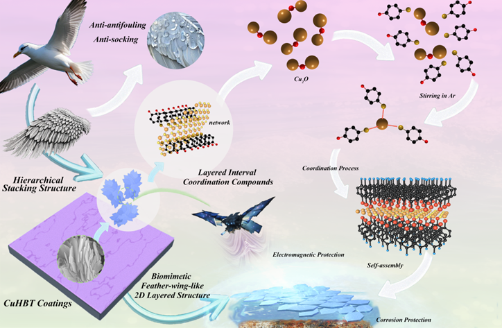 如图1所示,展示了仿生设计框架与制造流程。该设计直接借鉴了鸟类飞行羽毛的互锁堆叠结构,角蛋白羽毛叶片通过排列整齐的羽小枝方向和交错的羽小枝钩状结构形成分层排列,构建出兼具机械互锁与疏水润湿性的协同屏障系统。这一自然设计原理被成功转化为铜氢键拓扑(CuHBT)纳米片工程。在此工程中,受控配体交换驱动的堆叠方式不仅复制了致密曲折路径屏障,还形成了各向异性导电网络,有效抑制腐蚀性离子扩散并优化电磁波阻抗匹配。该方法通过微结构介导的多功能性,实现了传统上相互冲突的耐腐蚀性和金属化(MA)需求的平衡。本研究采用配体交换驱动组装策略,成功合成了新型二维半导体CuHBT。