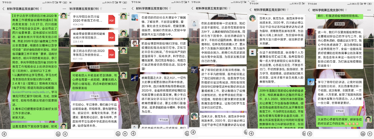 活动开始,由卢敏同志在支部微信群简要说明此次活动的目的、安排,以及想要达到的效果,然后上传有关的文件供大家自主学习,学习完成后大家再线上交流总结。文件下发后同志们就投入认真的学习当中,通过学习相关文件精神,支部党员同志均受益匪浅并在微信群互相交流学习后的心得体会,纷纷发表感悟。其中,杨程同志讲到:“百年大计,教育为本,教育关乎中华民族未来。2020年,四川省必将以习近平总书记系列重要讲话与论述为指导,统筹教育发展与改革,为治蜀兴川再上新台阶,为实现中华民族伟大复兴的中国梦,做出新的更大贡献。”田果同志说到:“在这个不平凡的假期,虽然疫情阻止了我们回校的步伐,但是我学习的热情却丝毫没有减退。同时看到党的领导们即便在这种时期仍然如此重视教育工作,更让我明白了疫情只是暂时的,党会带领我们克服一切困难,帮助我们更快更好的发展教育及各项事业,让我们的学习生活早日回归正轨。”陈铭同志分享到:“在抗击疫情取得一定成果后,我们还是不能放松,还是得在党的领导方针下,认真的做好自己的任务。同时在当下国情中,在经济建设的飞跃下,不能忘记国民教育,要完善教育体制,培养优秀的教育人才,要从各个方面提升国民素养,努力提升中国综合国力。而我们也应紧紧团结在党中央周围,为国家发展贡献自己的力量。”在轻松愉快的交流分享中,同志们畅所欲言,每位同志都分享了自己的心得体会,最后,历时2个小时的线上自主学习交流在卢敏同志的总结下顺利完成。