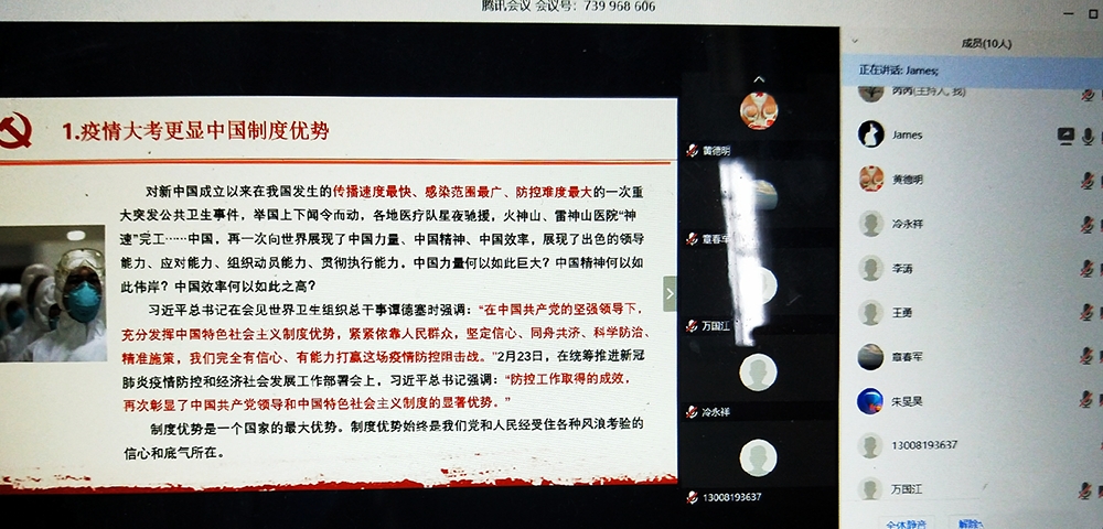 接着贺剑同志带领与会成员集中学习了《疫情大考更显中国制度优势》和《战“疫”彰显中国特色社会主义制度优势》两篇文章。贺剑同志讲到面对新中国成立以来在我国发生的传播速度最快、感染范围最广、防控难度最大的一次重大突发公共卫生事件,举国上下闻令而动,各地医疗队星夜驰援,火神山、雷神山医院“神速”完工……再一次向世界展现了中国力量、中国精神、中国效率。各项举措的层层落实也是中央权威的再次彰显,彰显了中国共产党领导和中国特色社会主义制度的显著优势。我们要增强“四个意识”、坚定“四个自”、做到“两个维护,坚信防疫工作的胜利终将到来。但也要清醒地认识到,疫情防控仍然是当前工作的重中之重。稍一松懈就会前功尽弃,务必要保持必要的警惕性,毫不放松,抓紧、抓实、抓细学院各项防控工作。