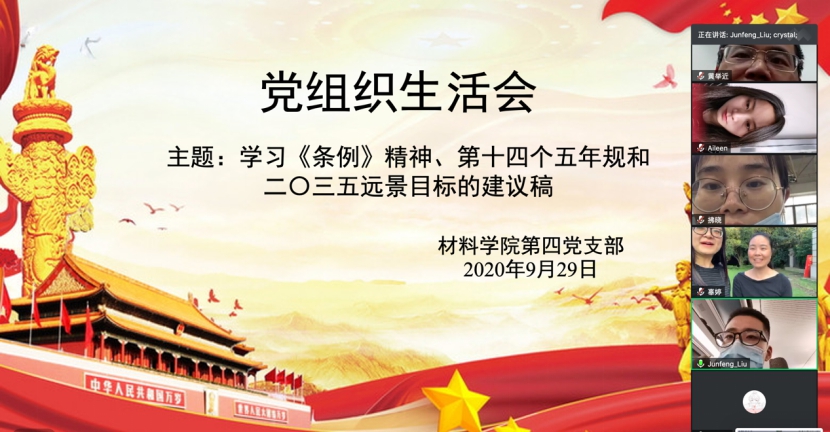 2020年9月29日,正值中共中央政治局会议之际,材料学院第四党支部组织召开了以“学习《条例》精神、十四五规划及二〇三五远景目标”为主题的党组织生活会,第四党支部全体成员参加了会议。