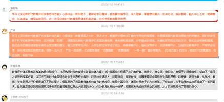 最后,其他支部成员也都在线上相继发表了自己的学习心得体会。通过本次线上学习讨论,支部成员们都深刻的体会到了教育事业是国家大计,教育评价体系的健全事关教育的发展方向。此次《总体方案》的出台,体现了教育评价的系统性,科学性,价值性。它的出台必将有利于加快构建具有中国特色的教育评价体系,为推进教育现代化发展提供了有力保障。至此,本次线上主题党日活动顺利结束!