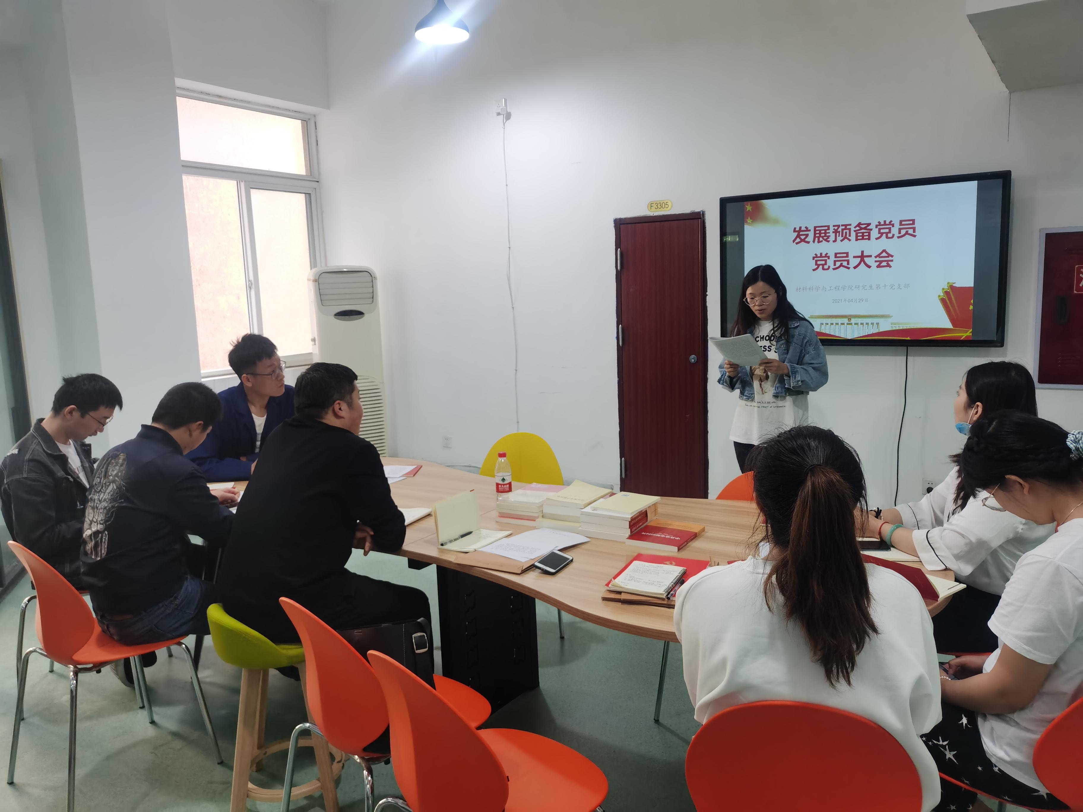 2021年4月29日上午11时,材料学院研究生第十党支部在九里校区三号楼J3318召开支部大会,会议由支部书记王誉静同志主持,支部党员同志参与,会议讨论表决是否同意发展朱子馨同学为中共预备党员。本支部共有党员10人,应到10人,实到8人,请假2人,符合发展预备党员大会召开条件。