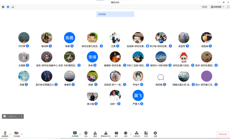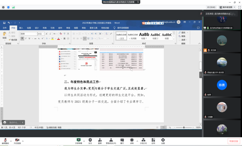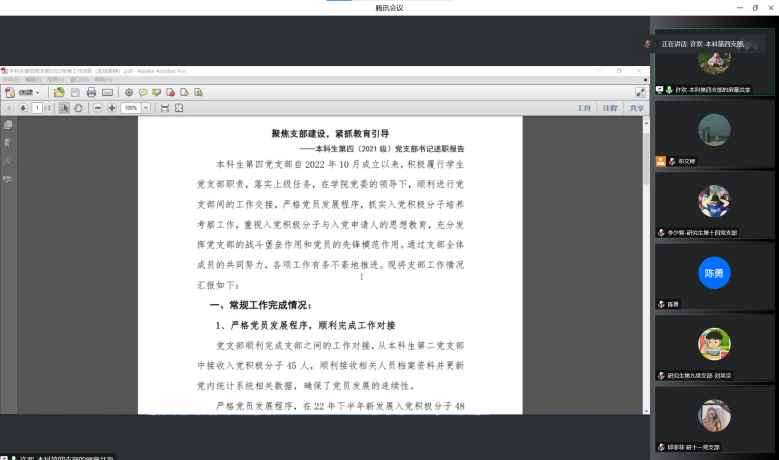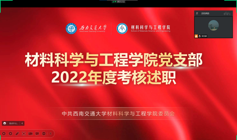 202212月23日上午,材料科学与工程学院党委结合当前实际情况在线上平台召开了7次党支部(扩大)会议暨2022年度党支部书记述职大会。学院党委书记陈勇、党委副书记章春军、李涛副院长、王勇副院长、教师代表杨炜沂、学生代表敖东以及全体党支部书记出席本次会议。会议由陈勇主持。