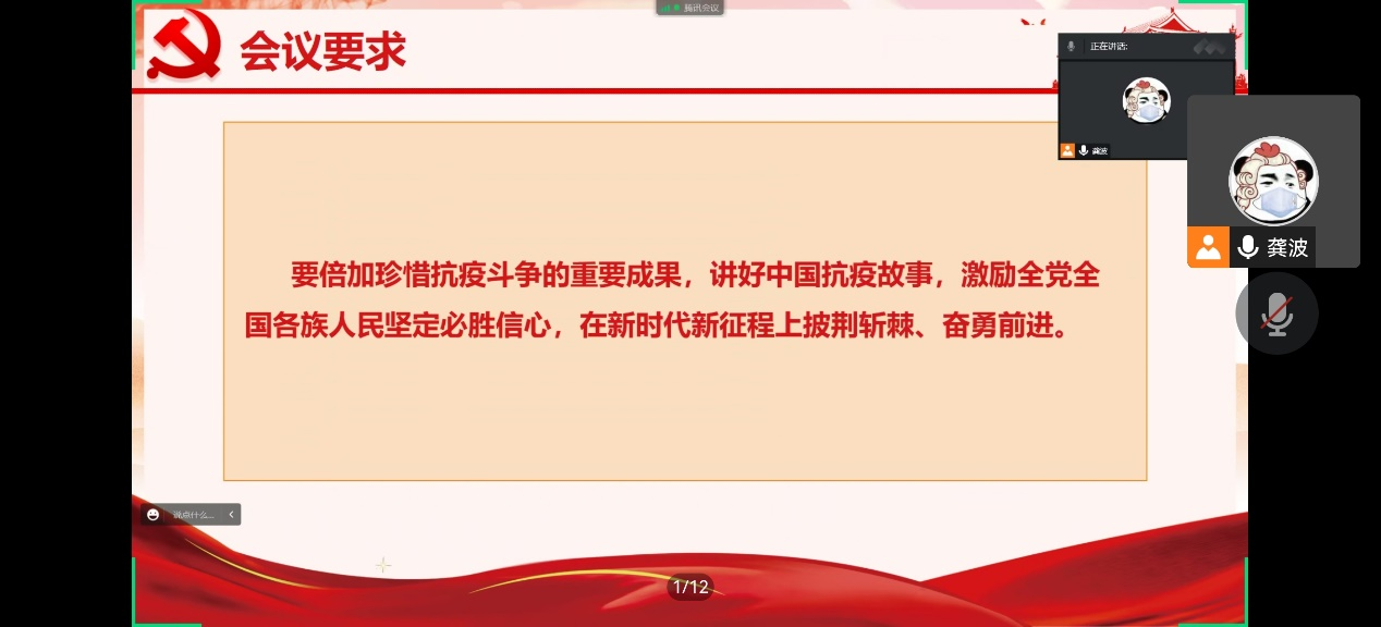 本科生第三党支部书记邓文婷同志进行总结,强调全体同志应该倍加珍惜抗疫斗争的重要成果,认真贯彻落实党中央的决策部署,团结一心,坚定必胜信心。与会同志也表示应始终自觉与党中央保持一致,继续在党的正确领导下,在新时代新征程上披荆斩棘,走好新的“赶考之路”。