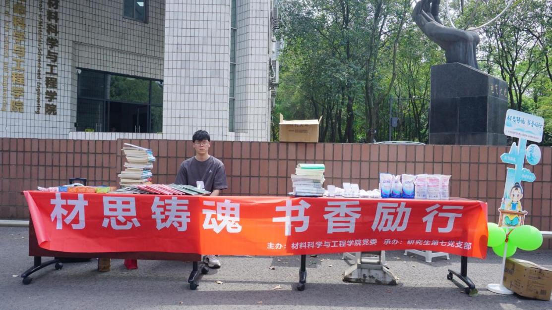 为深入贯彻落实中央八项规定精神,深化作风建设实践成果,材料学院研究生第七党支部于2025年世界读书日之际,在九里校区三号教学楼陈能宽院士纪念雕塑草坪,开展“材思铸魂·书香励行”主题党建活动。本次活动以草坪读书会和旧书回收换礼的“双线融合”形式同时开展,传承科学家精神,感受知识传递,同时将回收书籍通过公益爱心协会捐赠给贫困地区的学生,为山区学子架设知识桥梁。