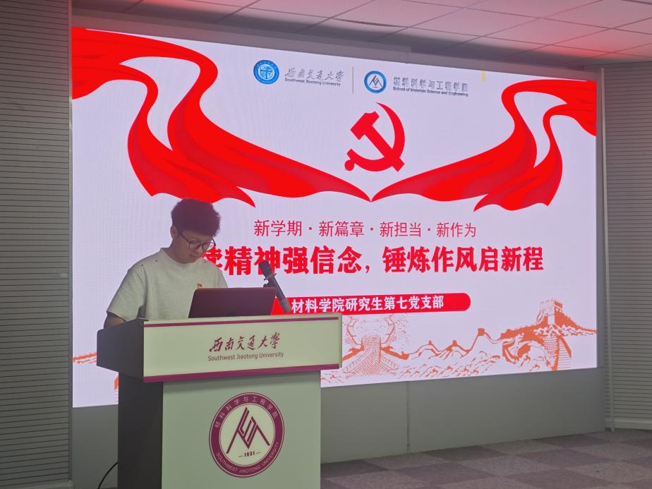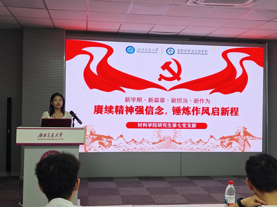 在全面贯彻党的二十大精神、扎实推进新时代党的建设新的伟大工程背景下,为持续巩固拓展主题教育成果,进一步加强研究生党员思想政治引领和纪律作风建设,2025年9月12日,威廉希尔WilliamHill官方网站研究生第七党支部在九里校区3号楼3324会议室,组织召开新学期第一次主题党日活动。本次活动的主题为“赓续精神强信念,锤炼作风启新程”。学院团委书记王誉静、党建负责人张宝开等老师莅临指导。支部全体党员、部分入党积极分子及入党申请人共同参加。活动由党支部书记邰浩云主持。