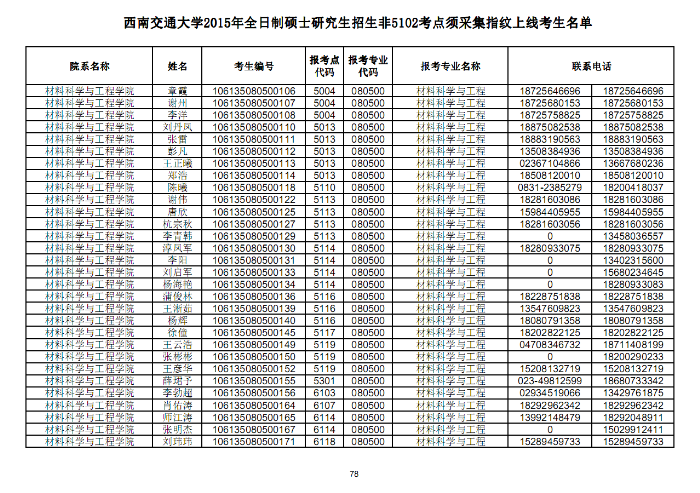 [本科生]西南交通大学2015年全日制硕士研究生招生非5102考点须采集指纹上线考生名单