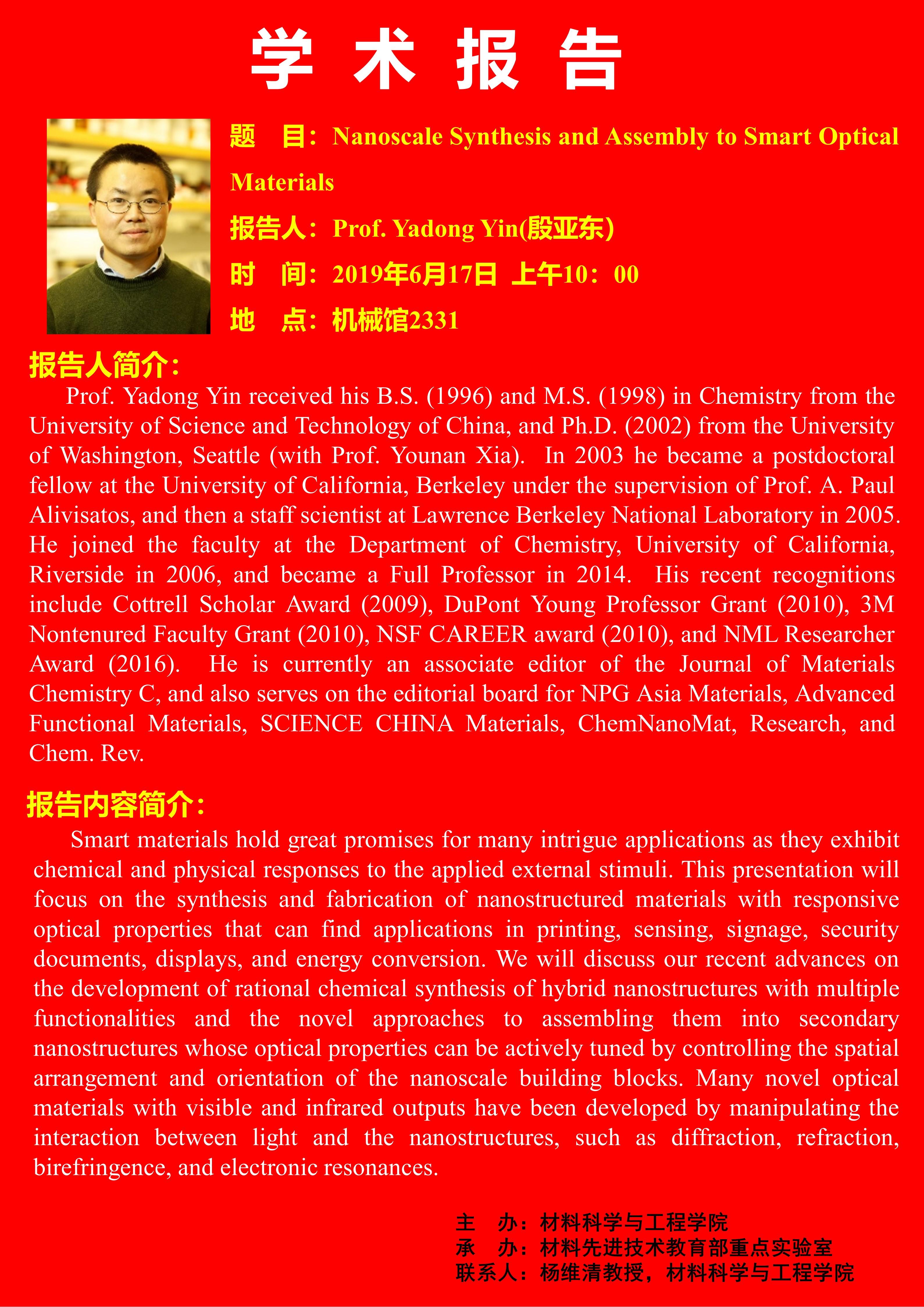 [学术海报]学术报告-Nanoscale Synthesis and Assembly to Smart Optical Materials